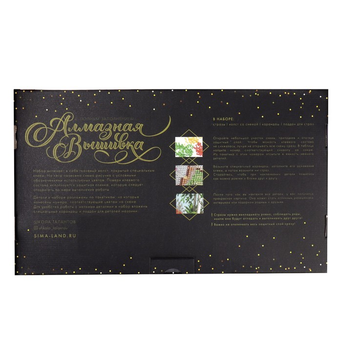 Тканевая основа имеет исключительное клеевое покрытие, которое надёжно удерживает кристаллики. С помощью специального карандаша вам нужно разложить их по нарисованной схеме с обозначением необходимых цветов, полностью заполнив полотно.