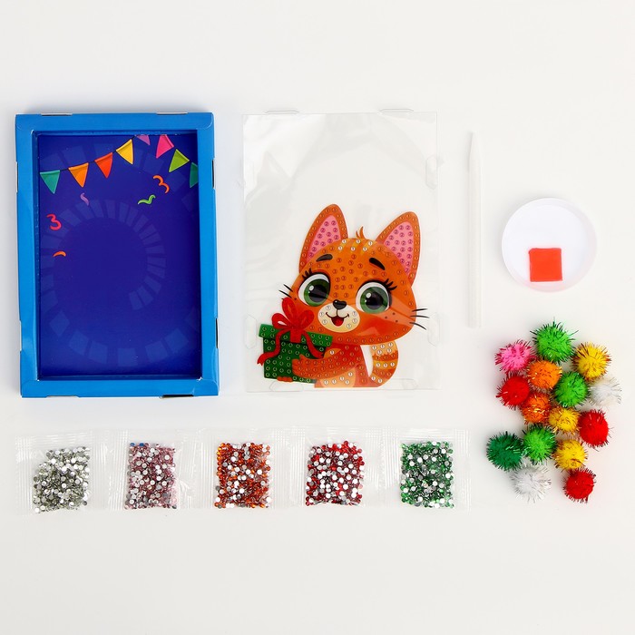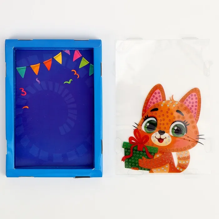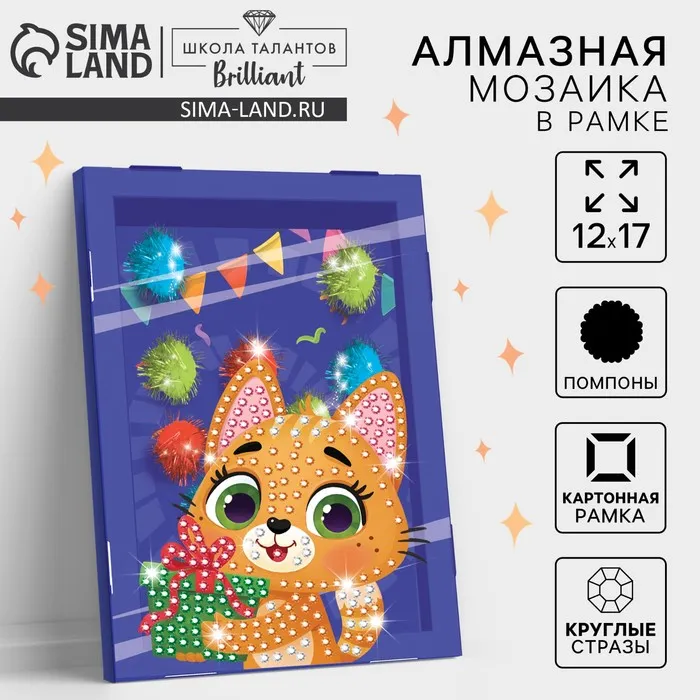 Алмазная мозаика на новый год в рамке для детей «Котик с подарком», набор для творчества — Характеристики
