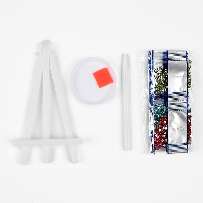 В наборе есть небольшой мольберт: с ним готовое творение можно расположить на полке или столе без дополнительных креплений. В таком интересном оформлении сверкающая картина будет выглядеть как предмет искусства.