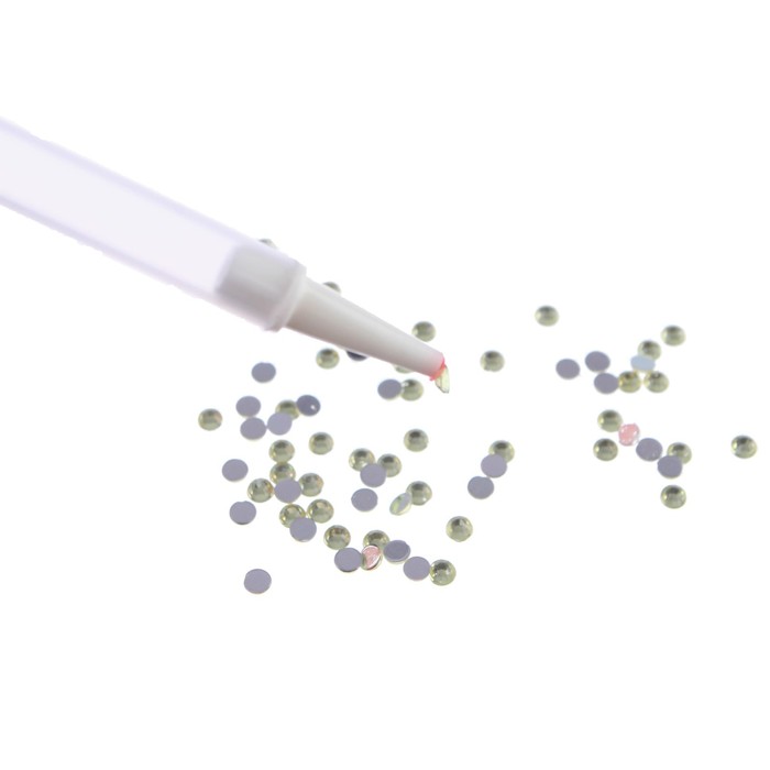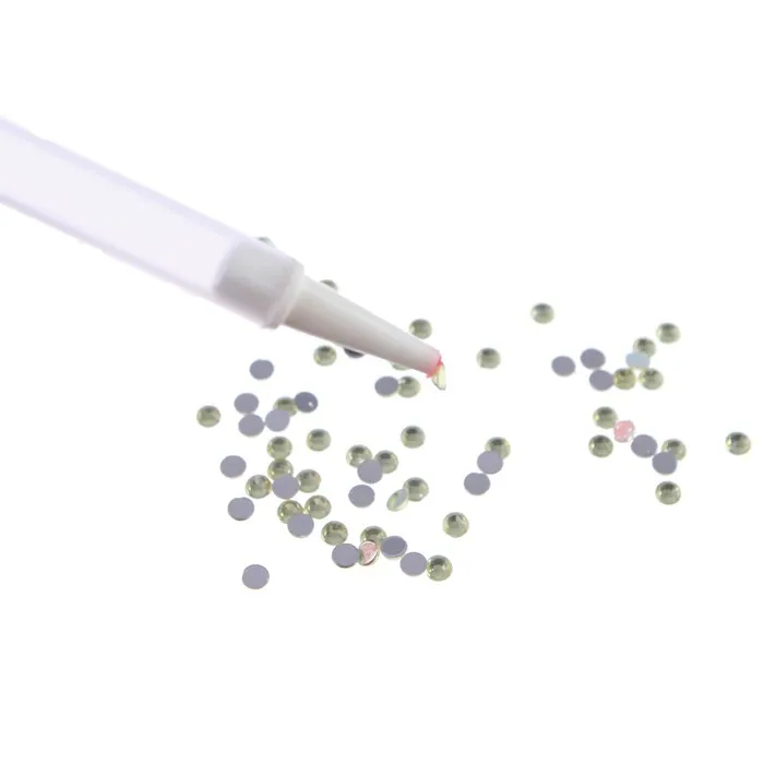 Снимите защитную плёнку с клеевой подушечки. Окуните в неё карандаш для алмазной вышивки таким образом, чтобы клей попал внутрь стержня. Он поможет вам с лёгкостью перенести стразы из поддона на картинку.