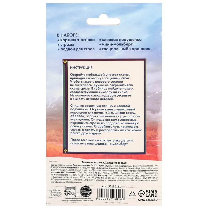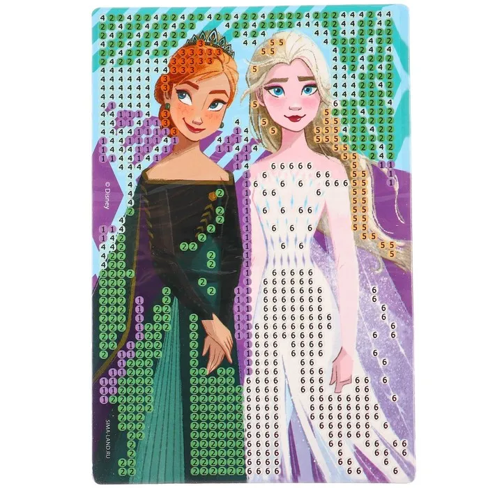 Ребёнку предстоит разложить кристаллики карандашом по пронумерованной схеме, заполнив всё полотно. Основа с клеевым покрытием будет надёжно удерживать стразы. На ней уже обозначены необходимые оттенки, а цветовая таблица расположена на упаковке.
