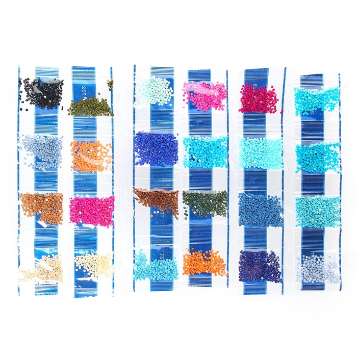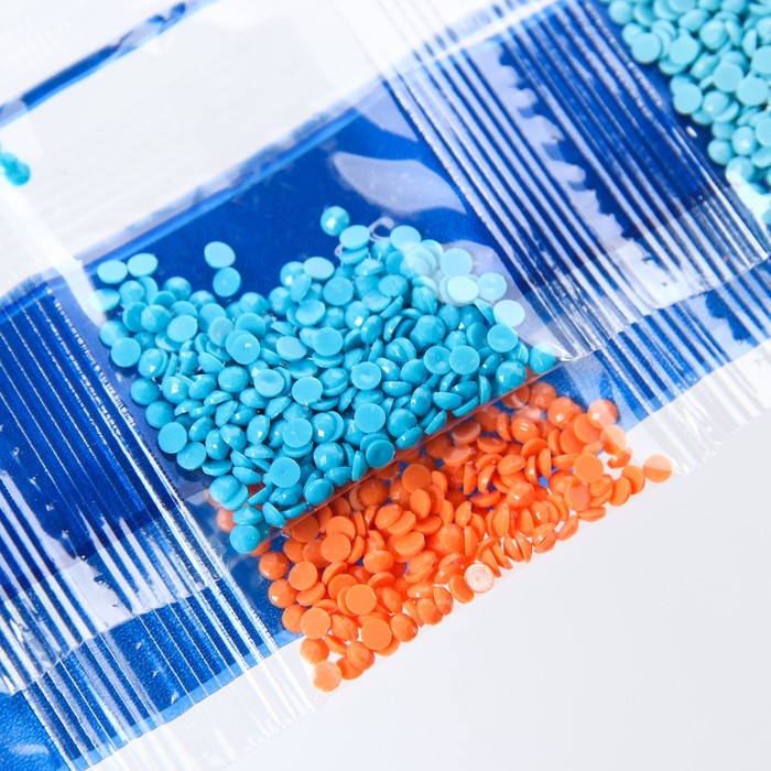 - Из пакетика с номером, который соответствует схеме, отсыпьте в ёмкость немного стразов.