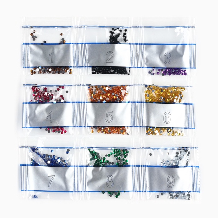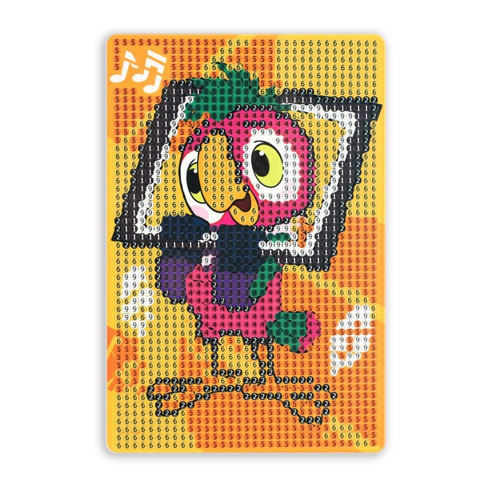 Ребёнку предстоит разложить кристаллики карандашом по пронумерованной схеме, заполнив всё полотно. Основа с клеевым покрытием будет надёжно удерживать стразы. На ней уже обозначены необходимые оттенки, а цветовая таблица расположена на упаковке.
