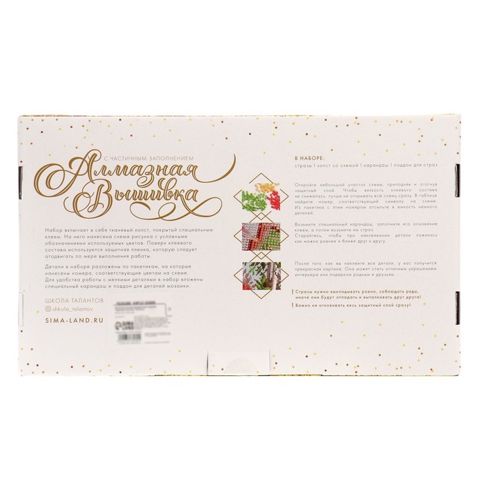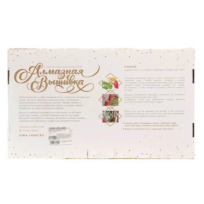 Часть изображения предстоит заполнить стразами, другая часть напечатана на холсте-основе. Поэтому набор подойдёт для тех, кто впервые пробует свои силы в этой технике или любит быстро добиваться результата.