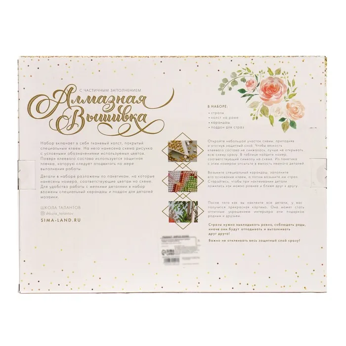 Часть изображения предстоит заполнить стразами, другая часть напечатана на холсте-основе. Поэтому набор подойдёт для тех, кто впервые пробует свои силы в этой технике или любит быстро добиваться результата.