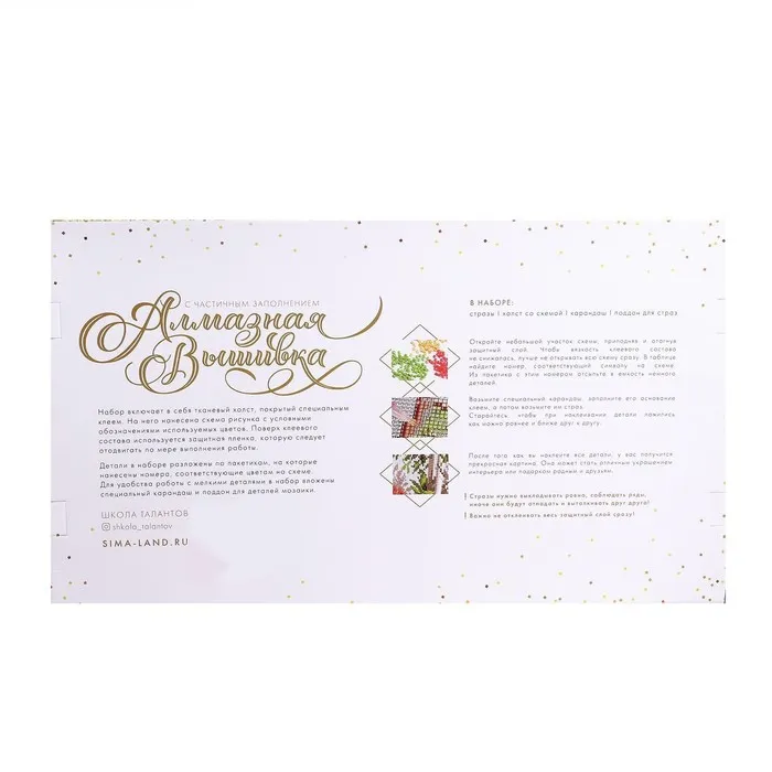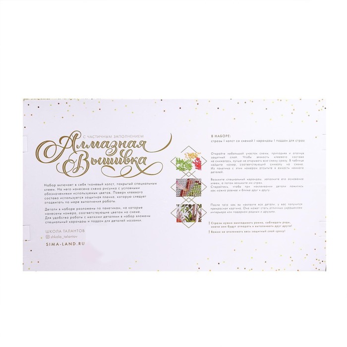 Часть картины предстоит заполнить стразами, другая часть напечатана на холсте-основе — такое изделие легче и быстрее создать. Поэтому набор подойдёт для тех, кто впервые пробует свои силы в этой технике или любит быстро добиваться результата.