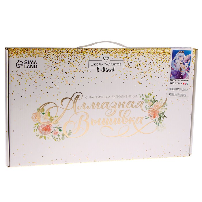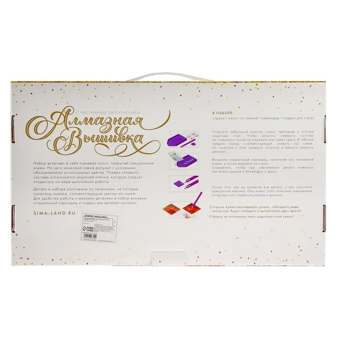 Часть картины предстоит заполнить стразами, другая часть напечатана на основе — такое изделие легче и быстрее создать. Поэтому набор такого небольшого формата подойдёт для тех, кто впервые пробует свои силы в этой технике или любит быстро добиваться результата.