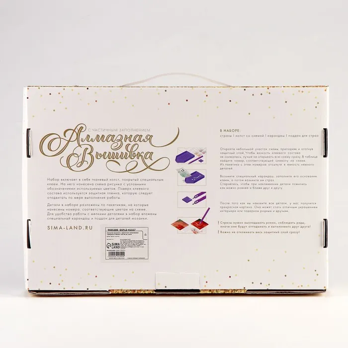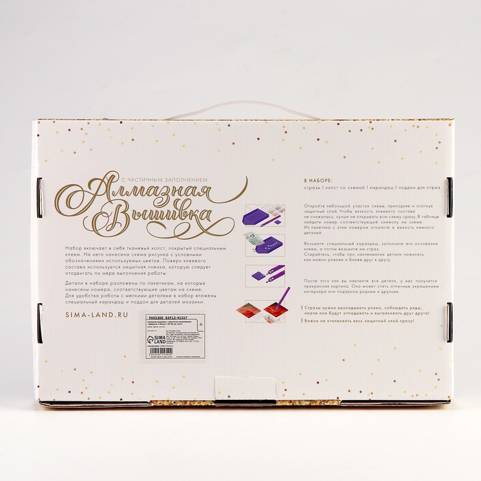Часть изображения предстоит заполнить стразами, другая часть напечатана на холсте-основе. Поэтому набор подойдёт для тех, кто впервые пробует свои силы в этой технике или любит быстро добиваться результата.