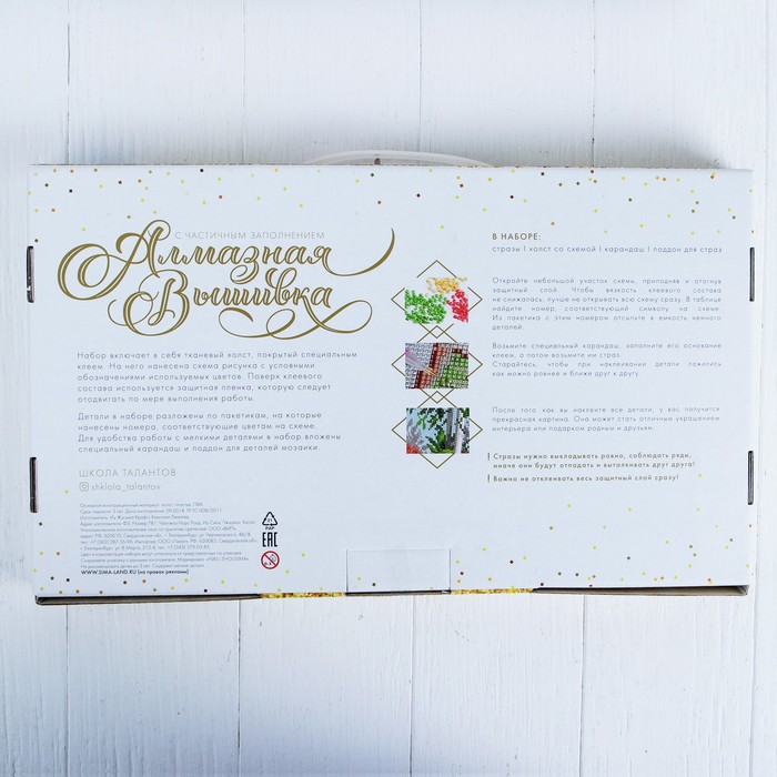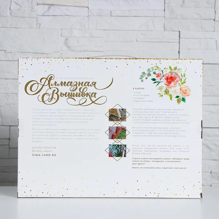 Часть изображения предстоит заполнить стразами, другая часть напечатана на холсте-основе. Поэтому набор подойдёт для тех, кто впервые пробует свои силы в этой технике или любит быстро добиваться результата.