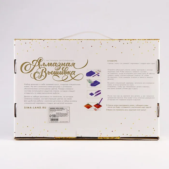 Часть изображения предстоит заполнить стразами, другая часть напечатана на холсте-основе. Поэтому набор подойдёт для тех, кто впервые пробует свои силы в этой технике или любит быстро добиваться результата.