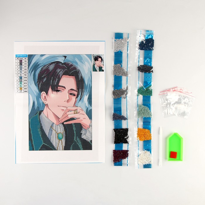 Разложите стразы с помощью карандаша по указанной схеме, заполнив полотно. Тканевая основа с точечным клеевым покрытием будет надёжно удерживать стразы. На картине уже обозначены необходимые оттенки, а цветовая таблица расположена рядом с рабочей областью холста.