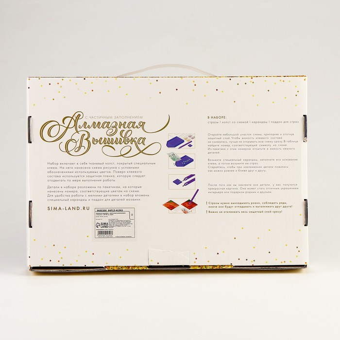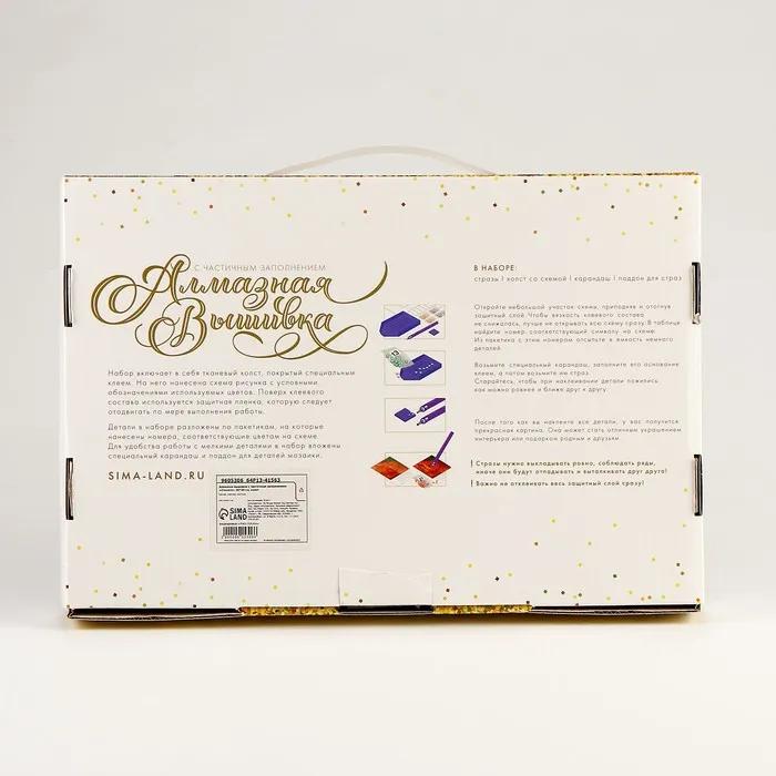 Часть изображения предстоит заполнить стразами, другая часть напечатана на холсте-основе. Поэтому набор подойдёт для тех, кто впервые пробует свои силы в этой технике или любит быстро добиваться результата.