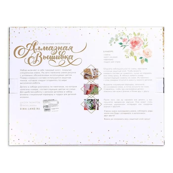 Часть картины предстоит заполнить стразами, другая часть напечатана на холсте-основе — такое изделие легче и быстрее создать. Поэтому набор подойдёт для тех, кто впервые пробует свои силы в этой технике или любит быстро добиваться результата.