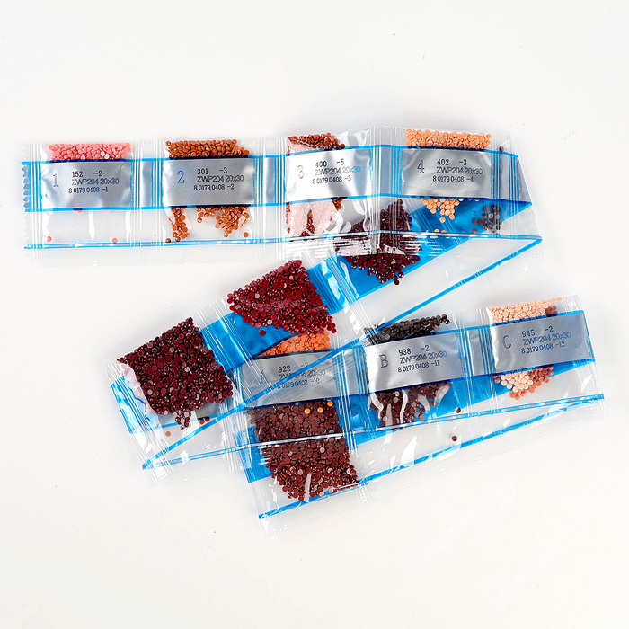 - Из пакетика с номером, который соответствует схеме, отсыпьте в ёмкость немного страз.