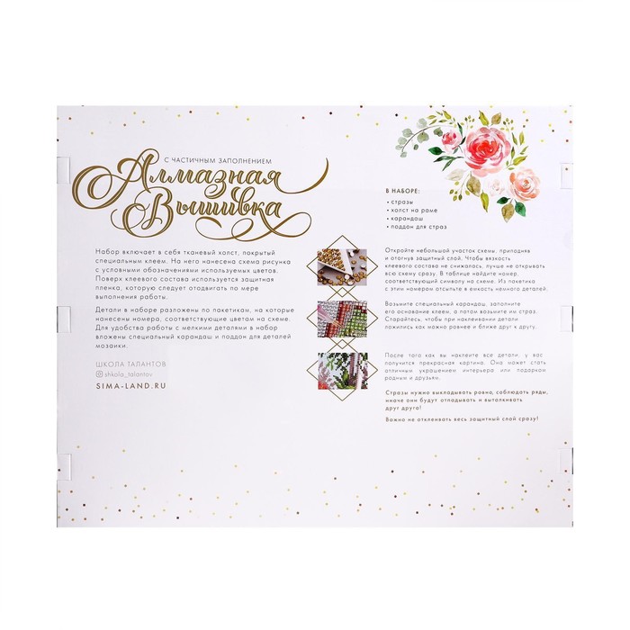 Часть картины предстоит заполнить стразами, другая часть напечатана на холсте-основе — такое изделие легче и быстрее создать. Поэтому набор подойдёт для тех, кто впервые пробует свои силы в этой технике или любит быстро добиваться результата.