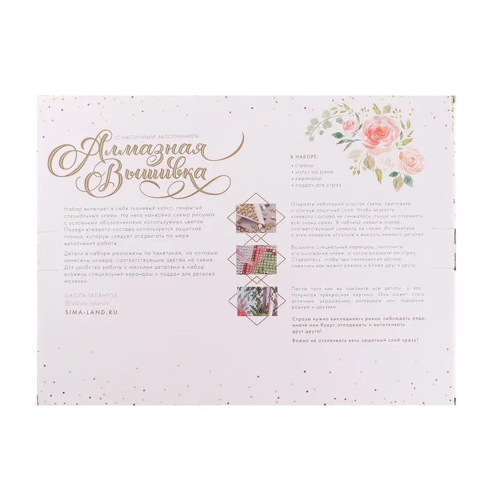 Часть картины предстоит заполнить стразами, другая часть напечатана на холсте-основе — такое изделие легче и быстрее создать. Поэтому набор подойдёт для тех, кто впервые пробует свои силы в этой технике или любит быстро добиваться результата.