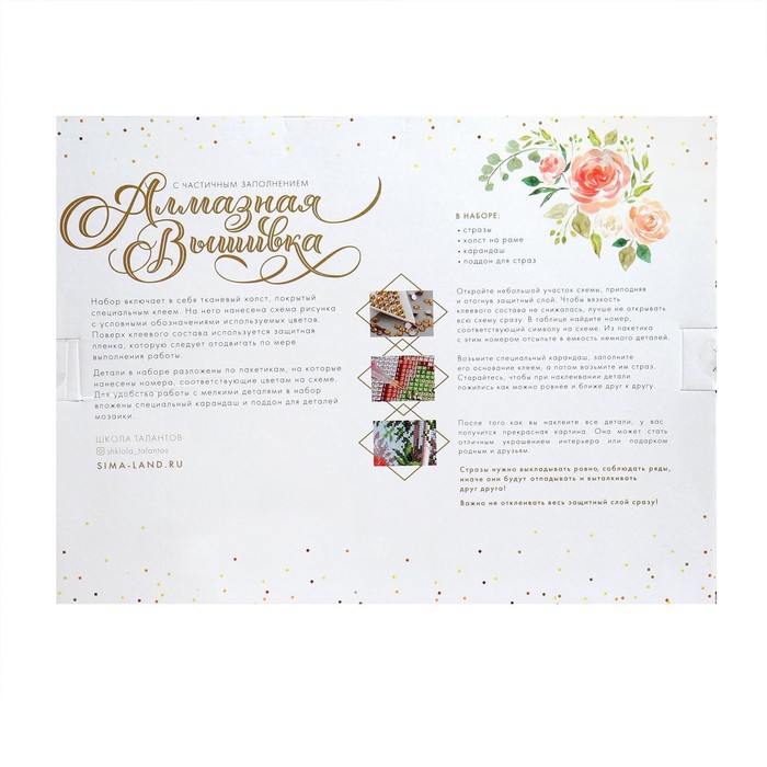 Часть картины предстоит заполнить стразами, другая часть напечатана на холсте-основе — такое изделие легче и быстрее создать. Поэтому набор подойдёт для тех, кто впервые пробует свои силы в этой технике или любит быстро добиваться результата.