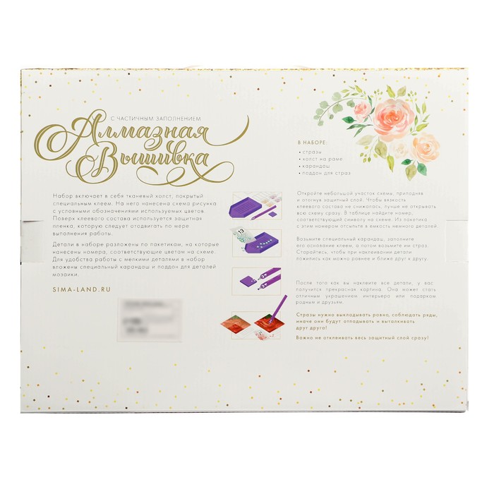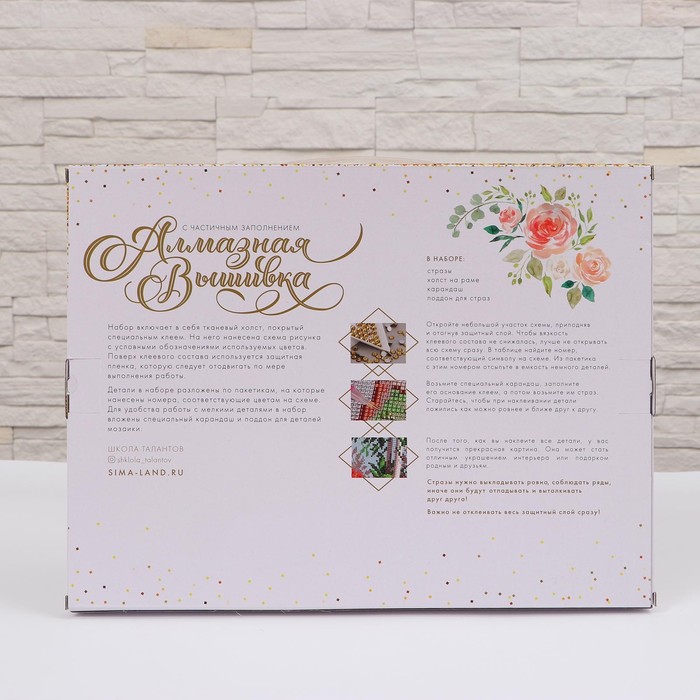Часть картины предстоит заполнить стразами, другая часть напечатана на холсте-основе — такое изделие легче и быстрее создать. Поэтому набор подойдёт для тех, кто впервые пробует свои силы в этой технике или любит быстро добиваться результата.