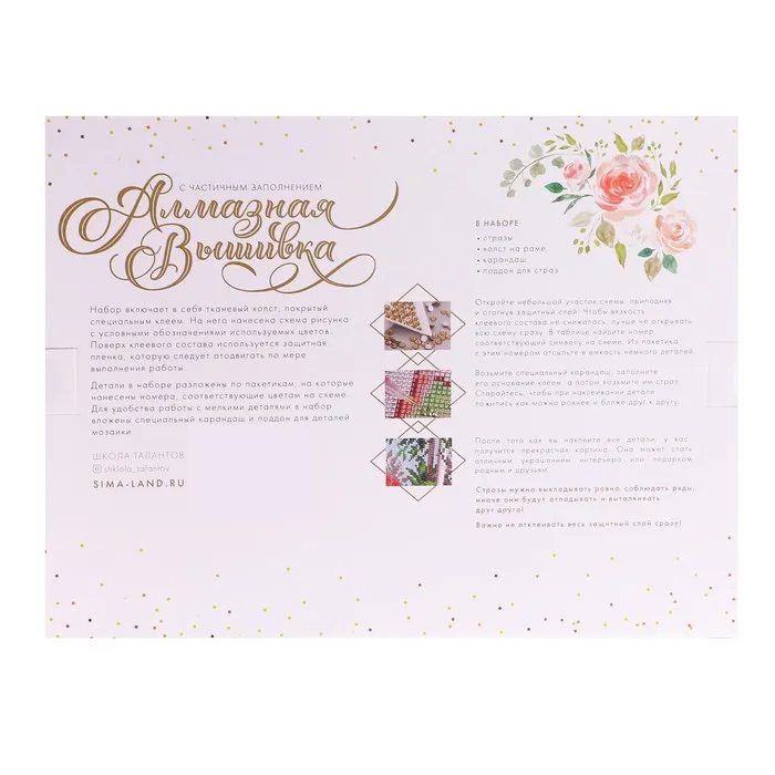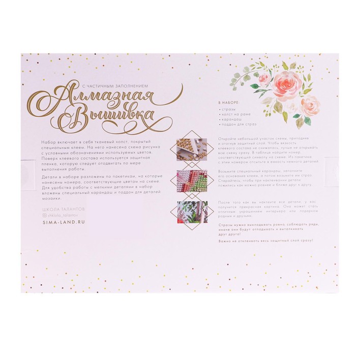 Часть картины предстоит заполнить стразами, другая часть напечатана на холсте-основе — такое изделие легче и быстрее создать. Поэтому набор подойдёт для тех, кто впервые пробует свои силы в этой технике или любит быстро добиваться результата.