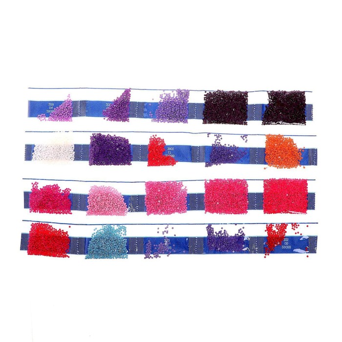 Разложите кристаллики с помощью карандаша по указанной схеме, заполнив полотно. Тканевая основа с точечным клеевым покрытием будет надёжно удерживать стразы. На картине уже обозначены необходимые оттенки.