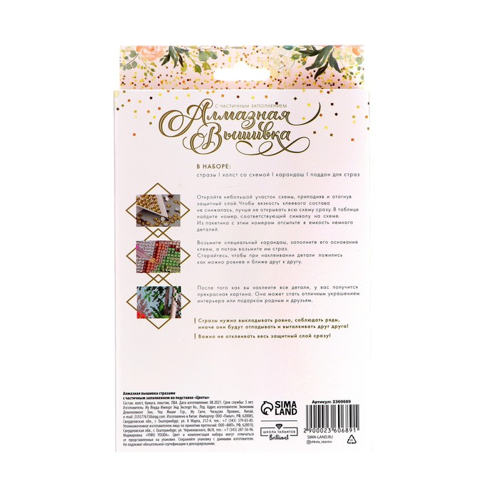 Часть картины предстоит заполнить стразами, другая часть напечатана на самом холсте — такое изделие легче и быстрее создать. Поэтому набор такого небольшого формата подойдёт для тех, кто впервые пробует свои силы в этой технике или любит быстро добиваться результата.