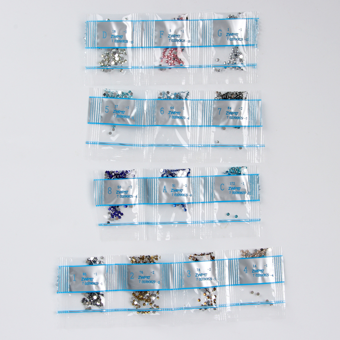 - Из пакетика с номером, который соответствует схеме, отсыпьте в ёмкость немного стразов.