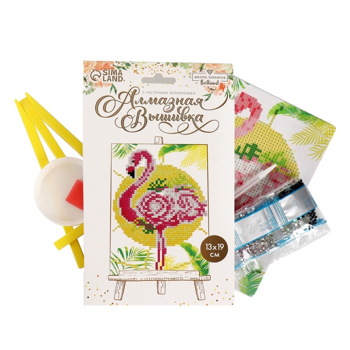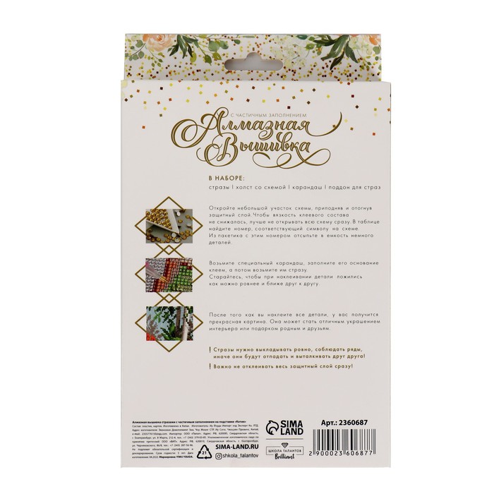 Часть картины предстоит заполнить стразами, другая часть напечатана на самом холсте — такое изделие легче и быстрее создать. Поэтому набор такого небольшого формата подойдёт для тех, кто впервые пробует свои силы в этой технике или любит быстро добиваться результата.