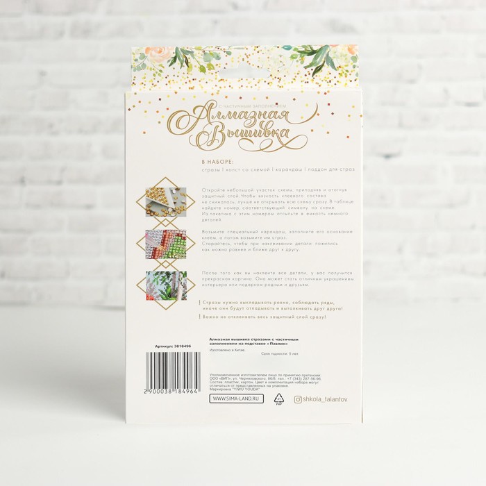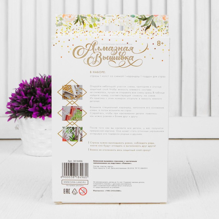 Часть картины предстоит заполнить стразами, другая часть напечатана на самом холсте — такое изделие легче и быстрее создать. Поэтому набор такого небольшого формата подойдёт для тех, кто впервые пробует свои силы в этой технике или любит быстро добиваться результата.