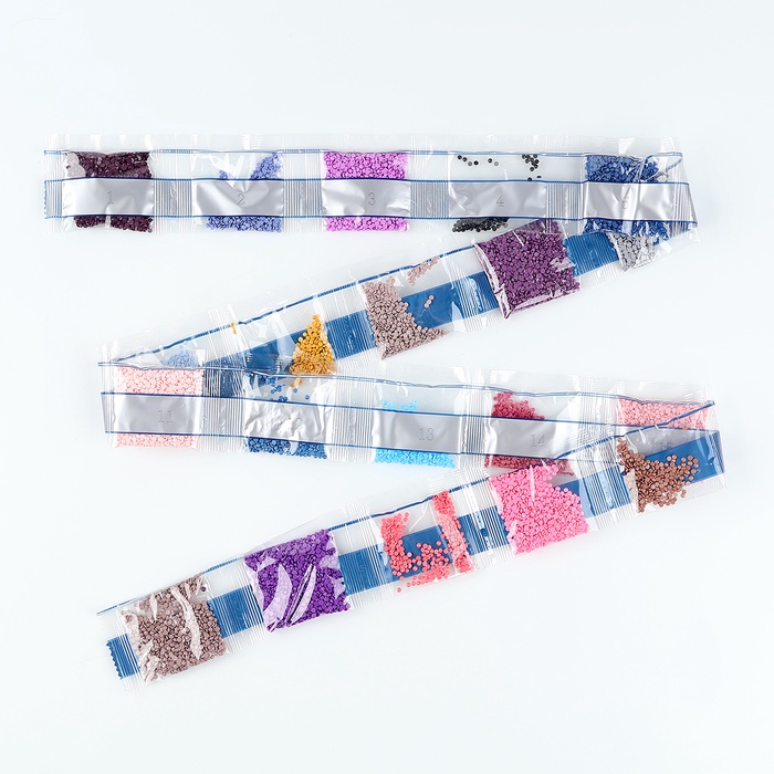 Вам предстоит разложить кристаллики карандашом по пронумерованной схеме. Холст с клеевым покрытием будет надёжно удерживать стразы.
