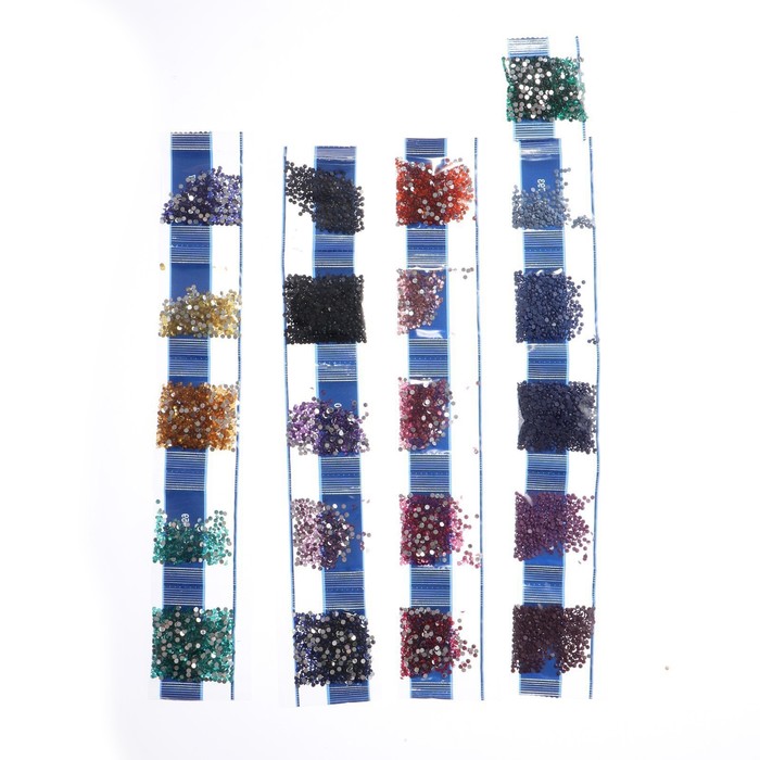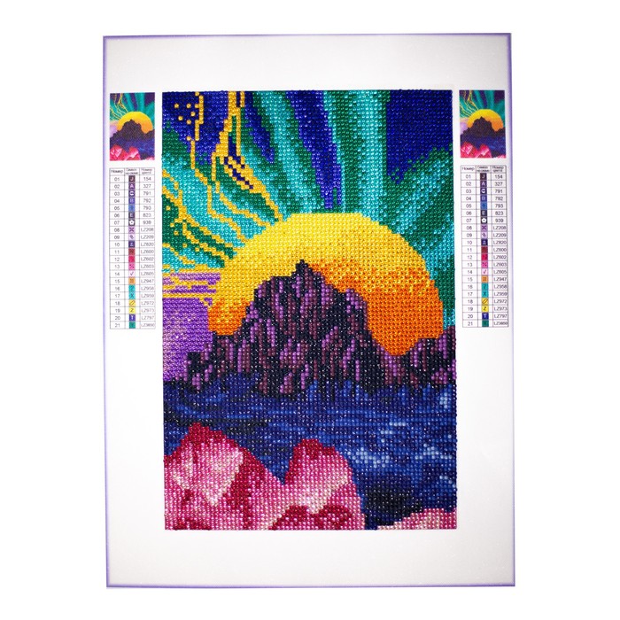 Разложите кристаллики с помощью карандаша по указанной схеме, заполнив полотно. На картине уже обозначены необходимые оттенки. Холст с клеевым покрытием будет надёжно удерживать стразы.