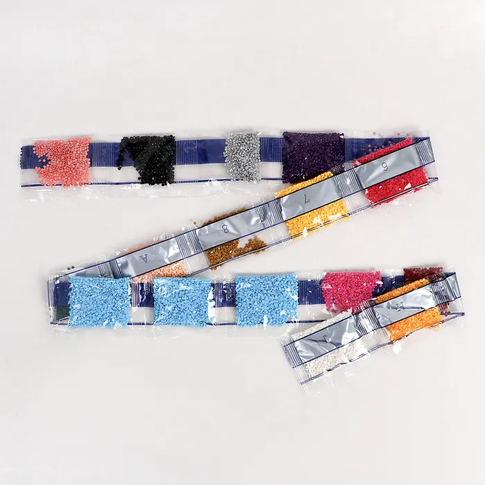 - Из пакетика с номером, который соответствует схеме, отсыпьте в ёмкость немного страз.
