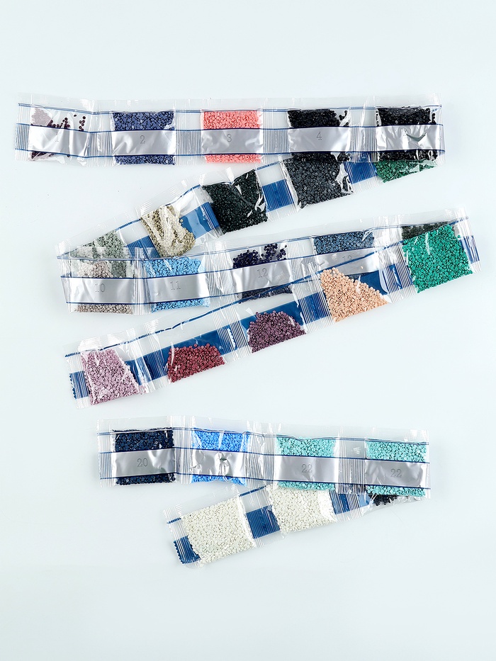 - Из пакетика с номером, который соответствует схеме, отсыпьте в ёмкость немного страз.