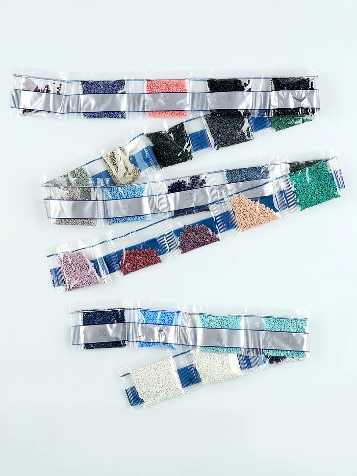 Вам предстоит разложить кристаллики карандашом по пронумерованной схеме. Холст с клеевым покрытием будет надёжно удерживать стразы.