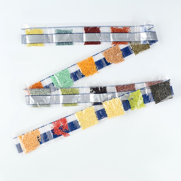 - Из пакетика с номером, который соответствует схеме, отсыпьте в ёмкость немного страз.