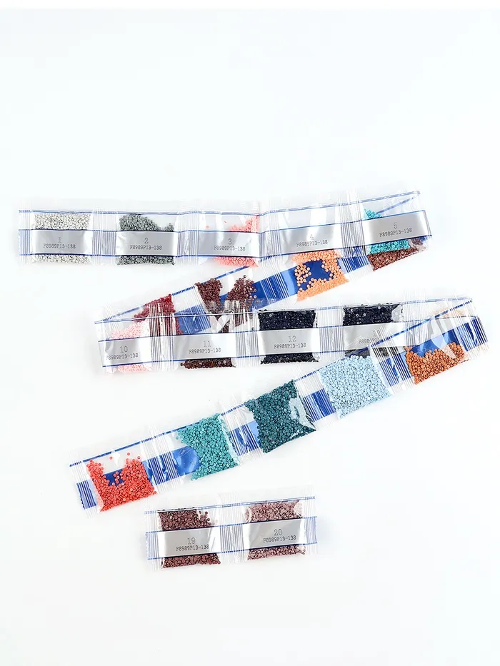 - Из пакетика с номером, который соответствует схеме, отсыпьте в ёмкость немного страз.