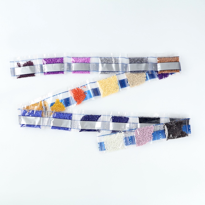 Вам предстоит разложить кристаллики карандашом по пронумерованной схеме. Холст с клеевым покрытием будет надёжно удерживать стразы.