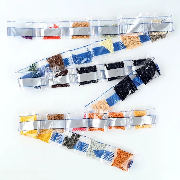 - Из пакетика с номером, который соответствует схеме, отсыпьте в ёмкость немного страз.