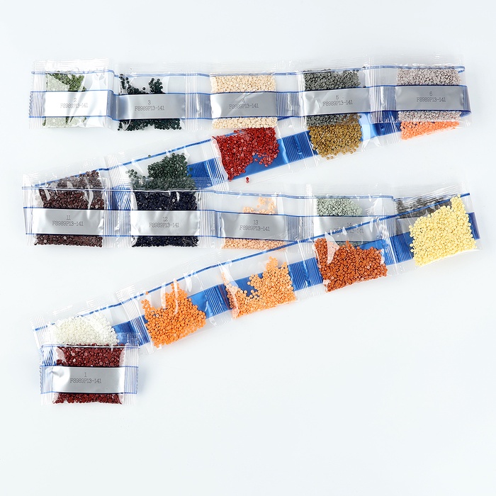 - Из пакетика с номером, который соответствует схеме, отсыпьте в ёмкость немного страз.