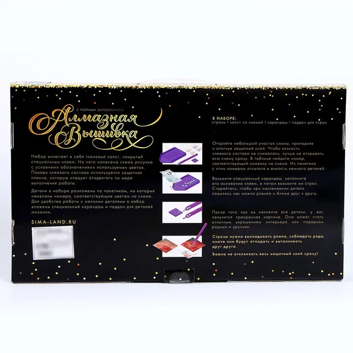 Часть картины предстоит заполнить стразами, другая часть напечатана на холсте-основе — такое изделие легче и быстрее создать. Поэтому набор подойдёт для тех, кто впервые пробует свои силы в этой технике или любит быстро добиваться результата.