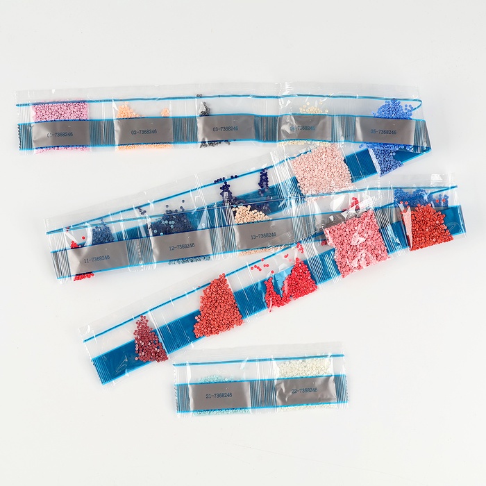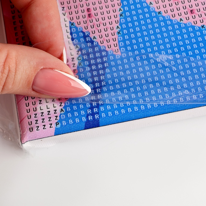 Разложите кристаллики с помощью карандаша по указанной схеме, заполнив всё полотно. На картине уже обозначены необходимые оттенки. Холст с клеевым покрытием будет надёжно удерживать стразы.