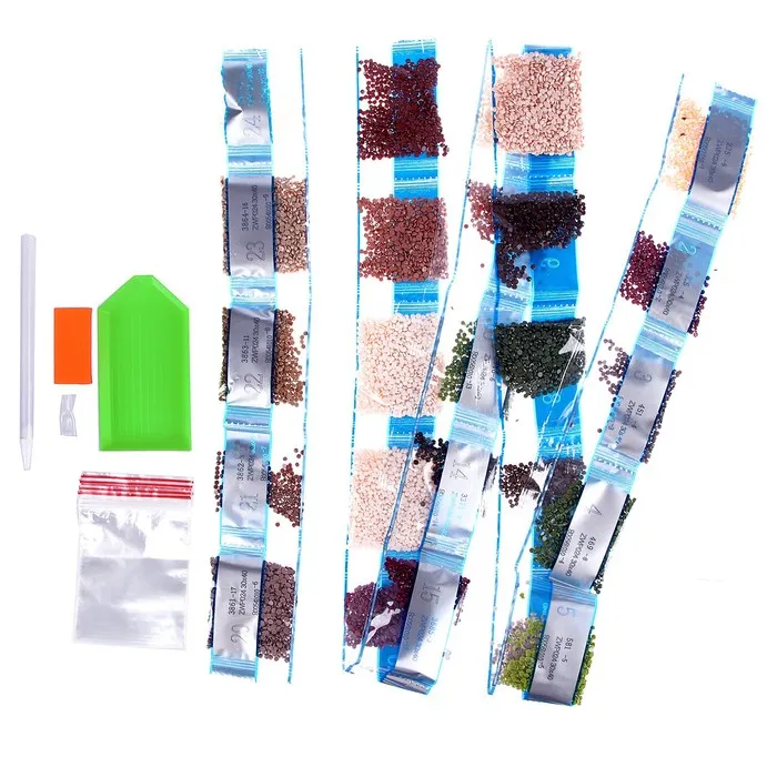 Разложите кристаллики с помощью карандаша по указанной схеме, заполнив всё полотно. На картине уже обозначены необходимые оттенки. Холст с клеевым покрытием будет надёжно удерживать стразы.