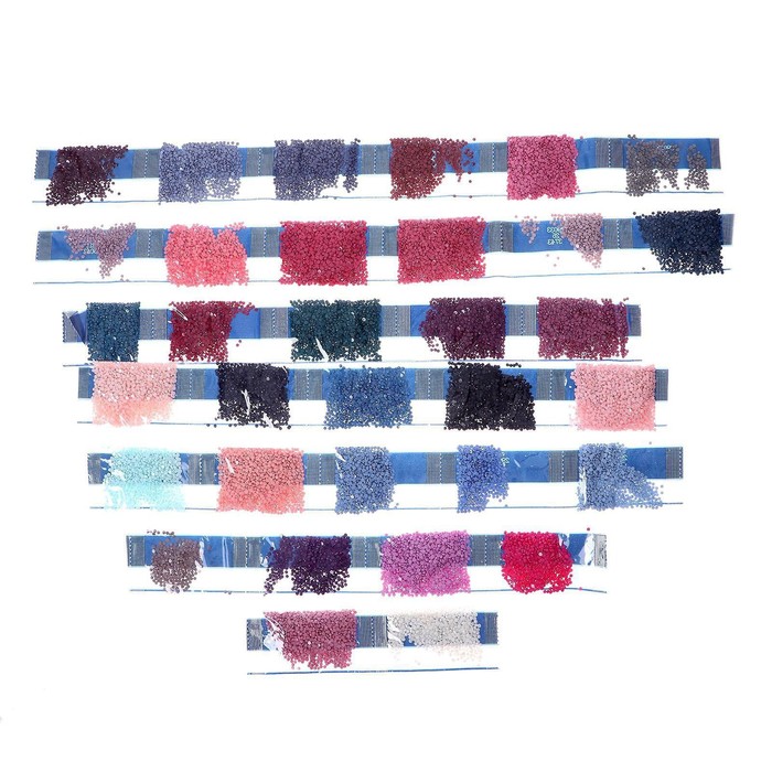 Разложите кристаллики с помощью карандаша по указанной схеме, заполнив всё полотно. На картине уже обозначены необходимые оттенки. Холст с клеевым покрытием будет надёжно удерживать стразы.