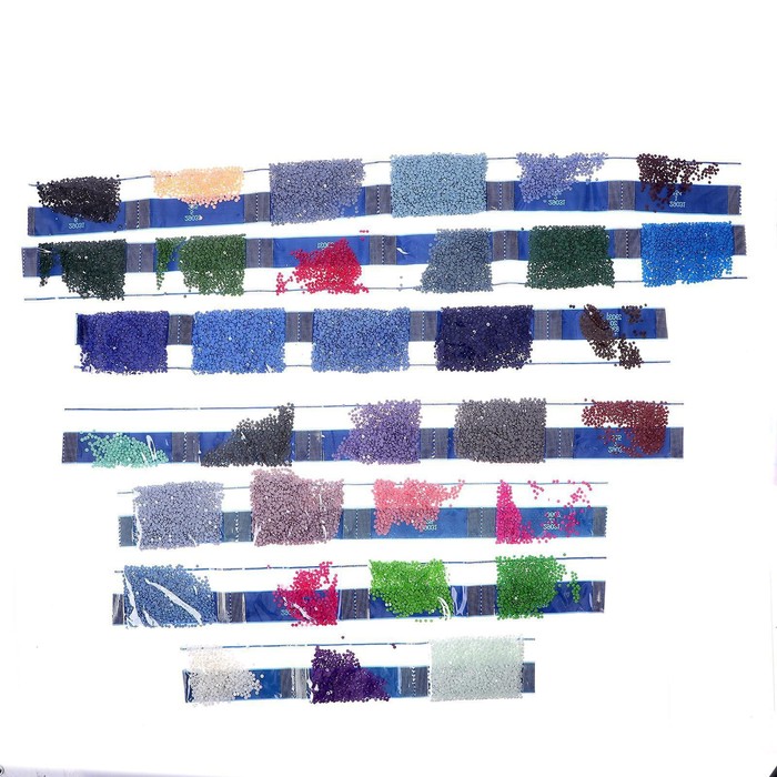 Разложите кристаллики с помощью карандаша по указанной схеме, заполнив всё полотно. На картине уже обозначены необходимые оттенки. Холст с клеевым покрытием будет надёжно удерживать стразы.