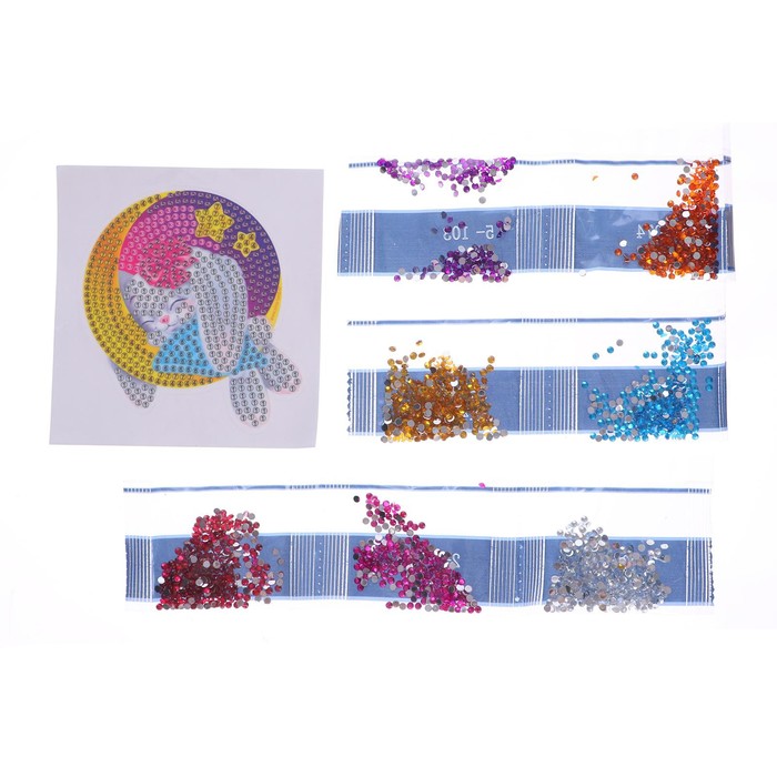 Ребёнку предстоит разложить карандашом кристаллики, постепенно заполняя рисунок элементами соответствующего цвета. Основа с клеевым покрытием будет надёжно удерживать стразы.
