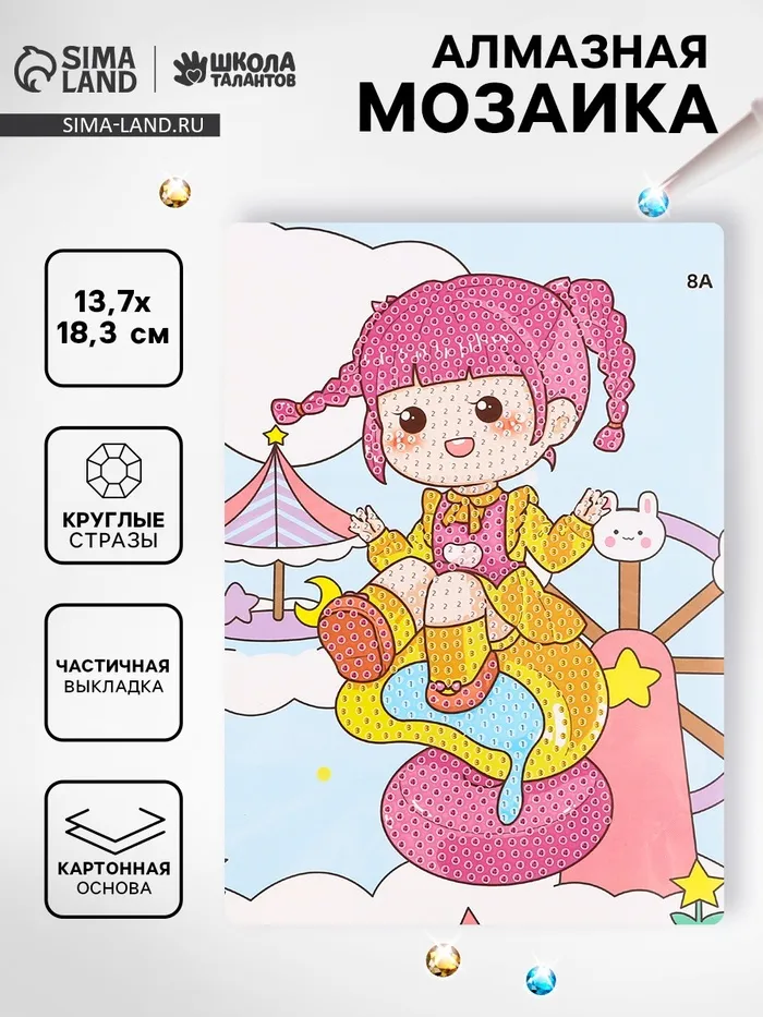 Алмазная мозаика — это чудесный творческий тренажёр для детей от 3 лет. Вы сможете вместе с ребёнком провести совместный досуг за картиной и создать яркий, забавный рисунок, которым потом можно будет украсить интерьер детской спальни. Алмазы прикрепляются на обозначенные цифрами поля, благодаря чему ребёнок тренирует внимание, мелкую моторику, а так же счёт и усидчивость.