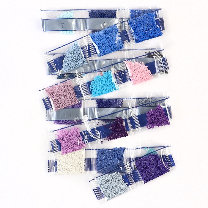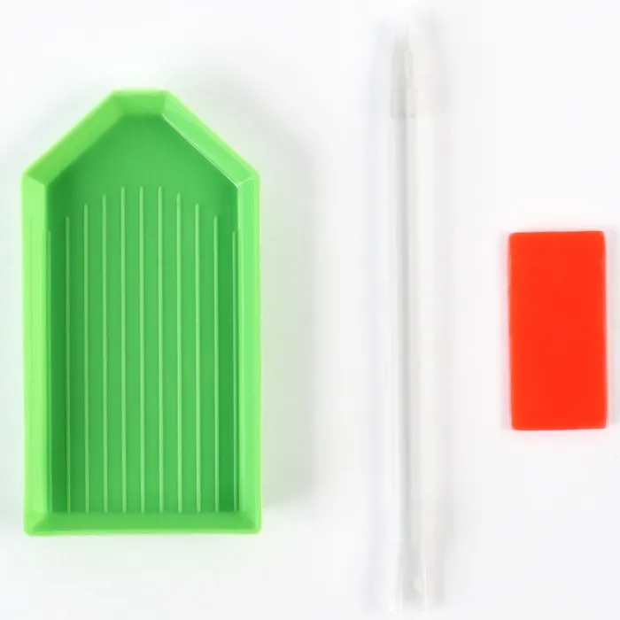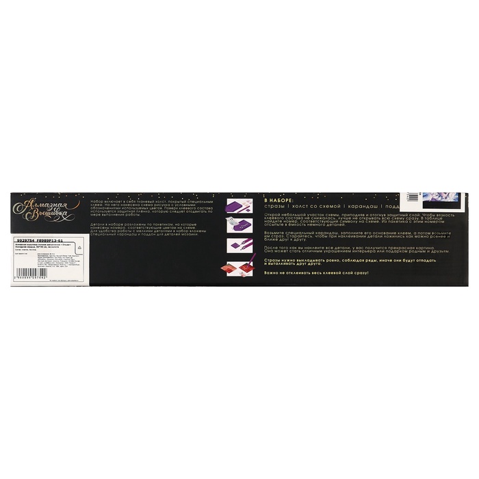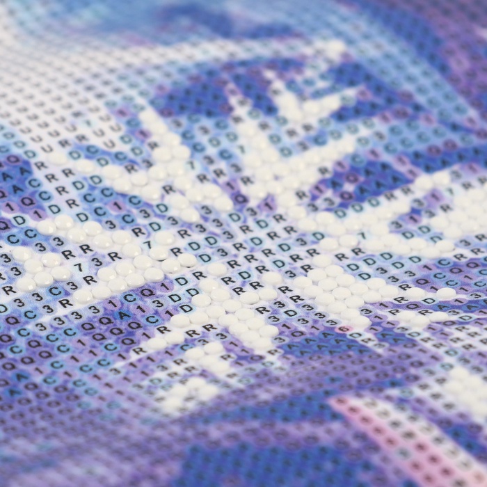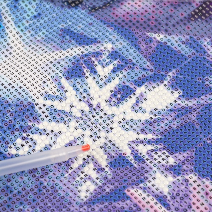 Разложите кристаллики с помощью специального карандаша по указанной схеме, заполните всё полотно. Тканевая основа с точечным клеевым покрытием будет надёжно удерживать стразы. На картине уже обозначены необходимые оттенки. Цветовая схема расположена рядом с рабочей областью холста, что удобно для работы с картиной.