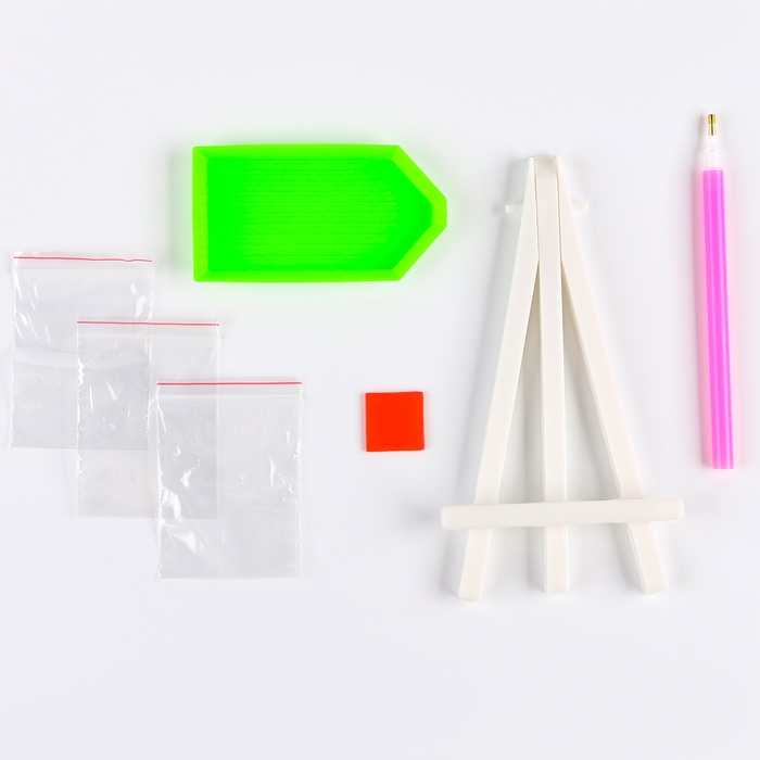 - Набор включает все необходимые материалы: картонный холст со схемой, стразы, карандаш для страз, клеевую подушечку, подставку для картины и ёмкость для страз.