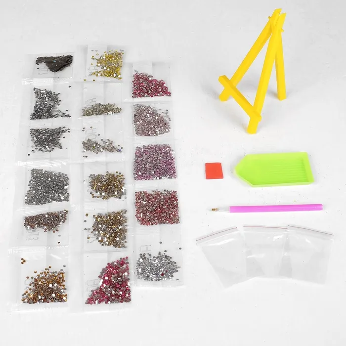 Часть картины предстоит заполнить стразами, другая часть напечатана на самом холсте — такое изделие легче и быстрее создать. Поэтому набор такого небольшого формата подойдёт для тех, кто впервые пробует свои силы в этой технике или любит быстро добиваться результата.
