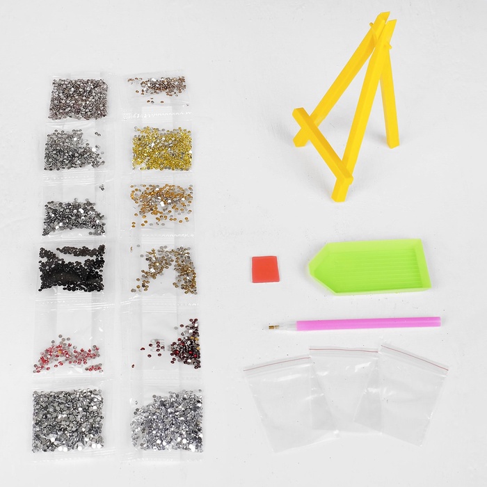 - Набор включает все необходимые материалы: картонный холст со схемой, стразы, карандаш для страз, клеевую подушечку, подставку для картины и ёмкость для страз.