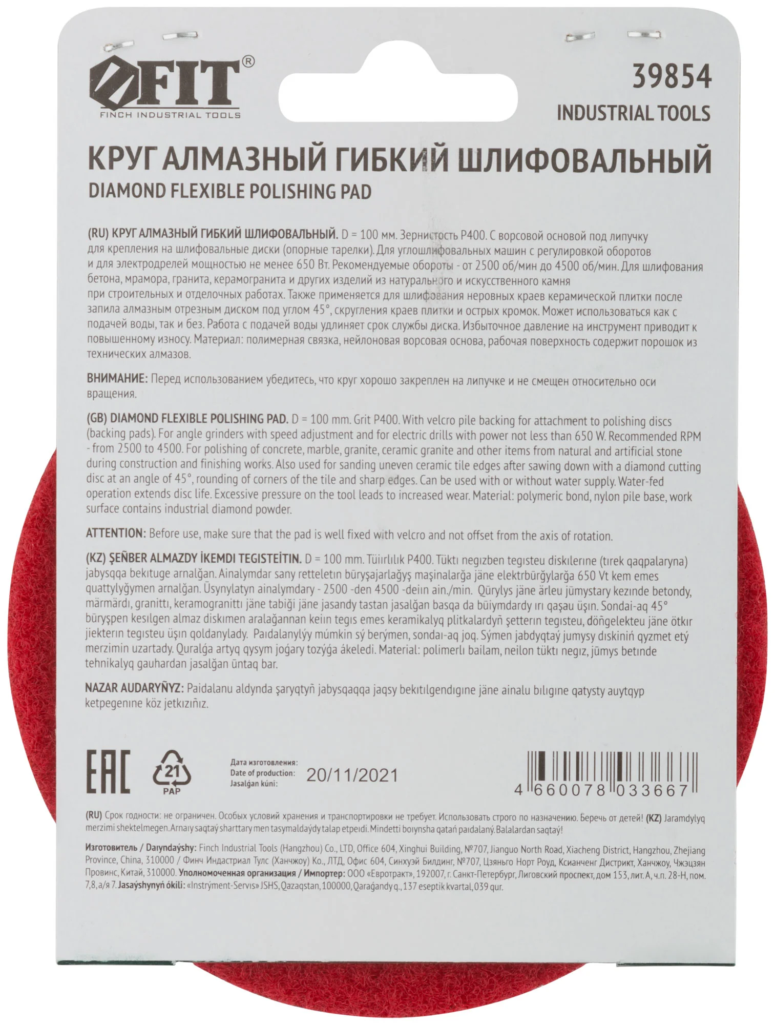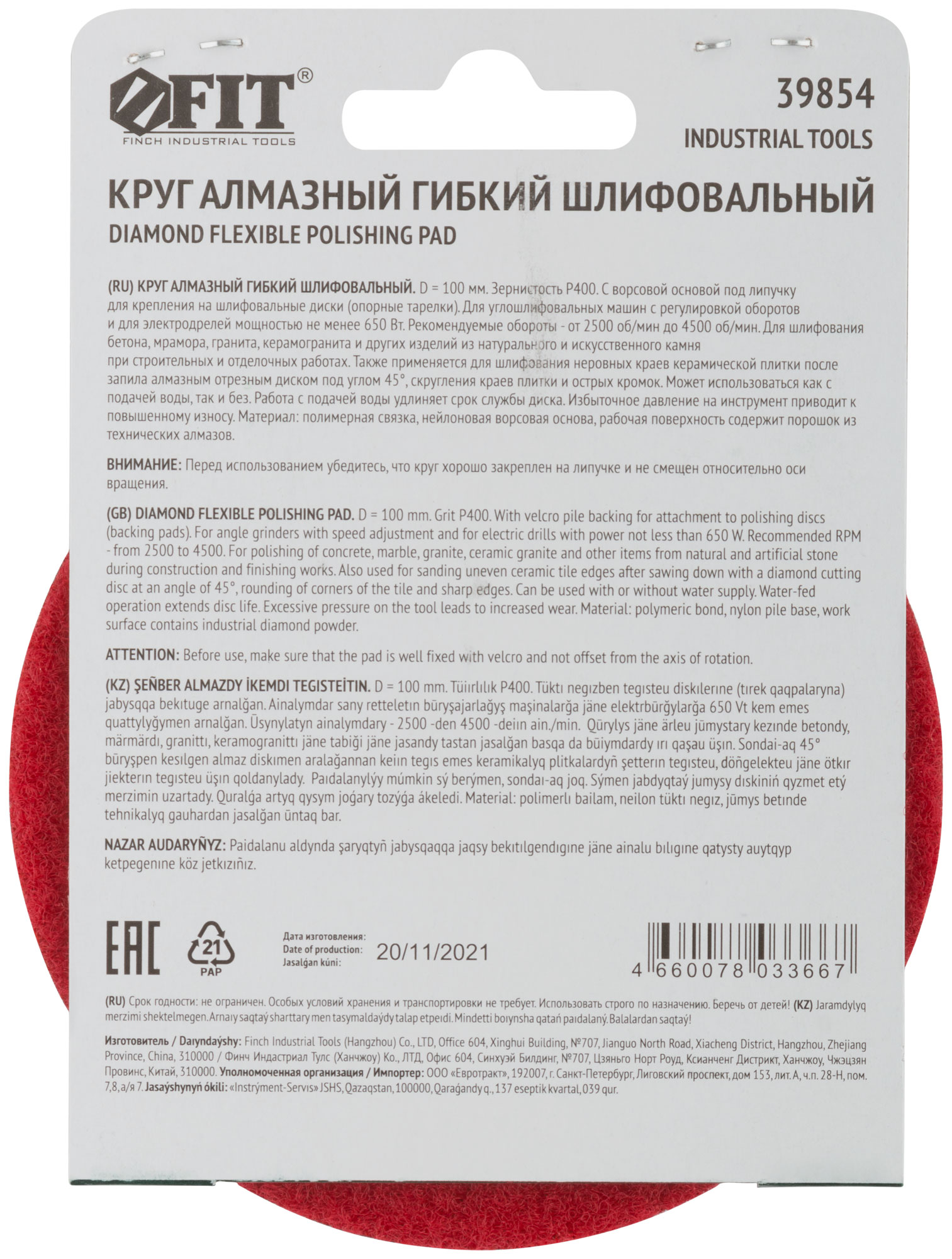 Алмазный гибкий шлифовальный круг FIT диаметром 100 мм и зернистостью P400 станет незаменимым помощником для специалистов, занимающихся обработкой каменных и бетонных поверхностей. Он идеально подходит для шлифования и полировки бетона, мрамора, гранита и керамогранита, а также для обработки керамической плитки после запила.